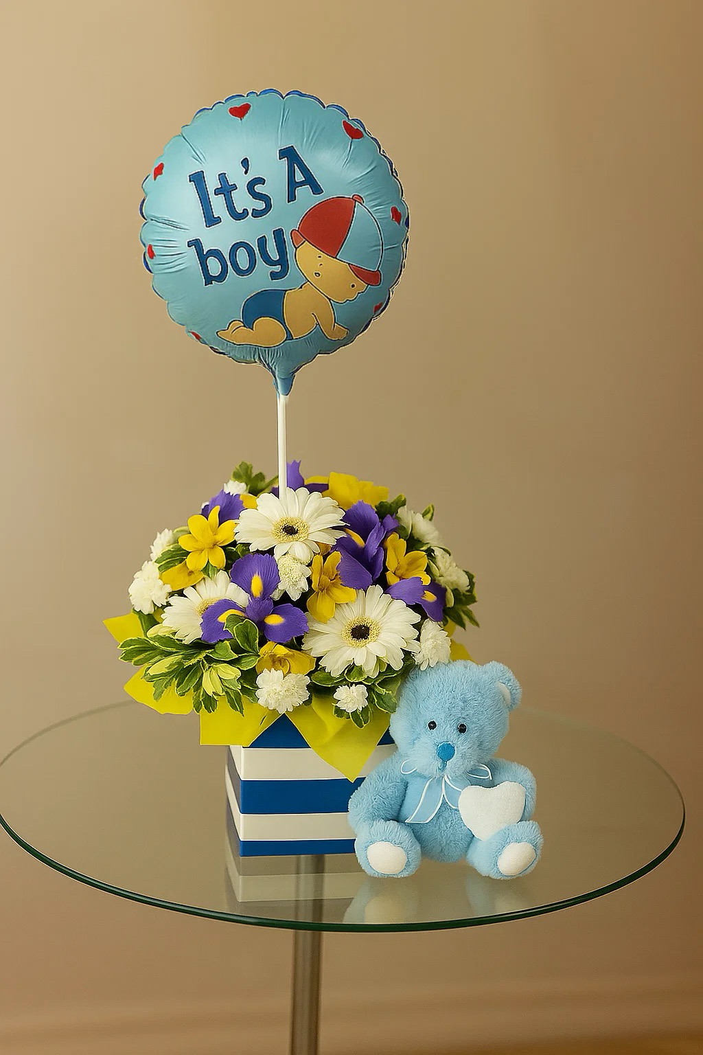 Designed to suit both baby girls and baby boys, this combo is available in soft pink or classic blue tones. The flowers are carefully arranged using fresh, seasonal blooms to create a delicate and joyful display that complements the occasion perfectly. The addition of a cuddly teddy bear makes the gift extra special, while the balloon adds a celebratory touch that instantly stands out.