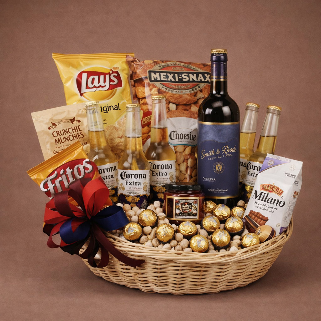 This carefully curated hamper includes refreshing Corona beers paired with a selection of gourmet snacks such as crackers, cheese sticks, and indulgent treats. Beautifully arranged in a woven basket and finished with a decorative ribbon, it’s ready to impress from the moment it arrives.