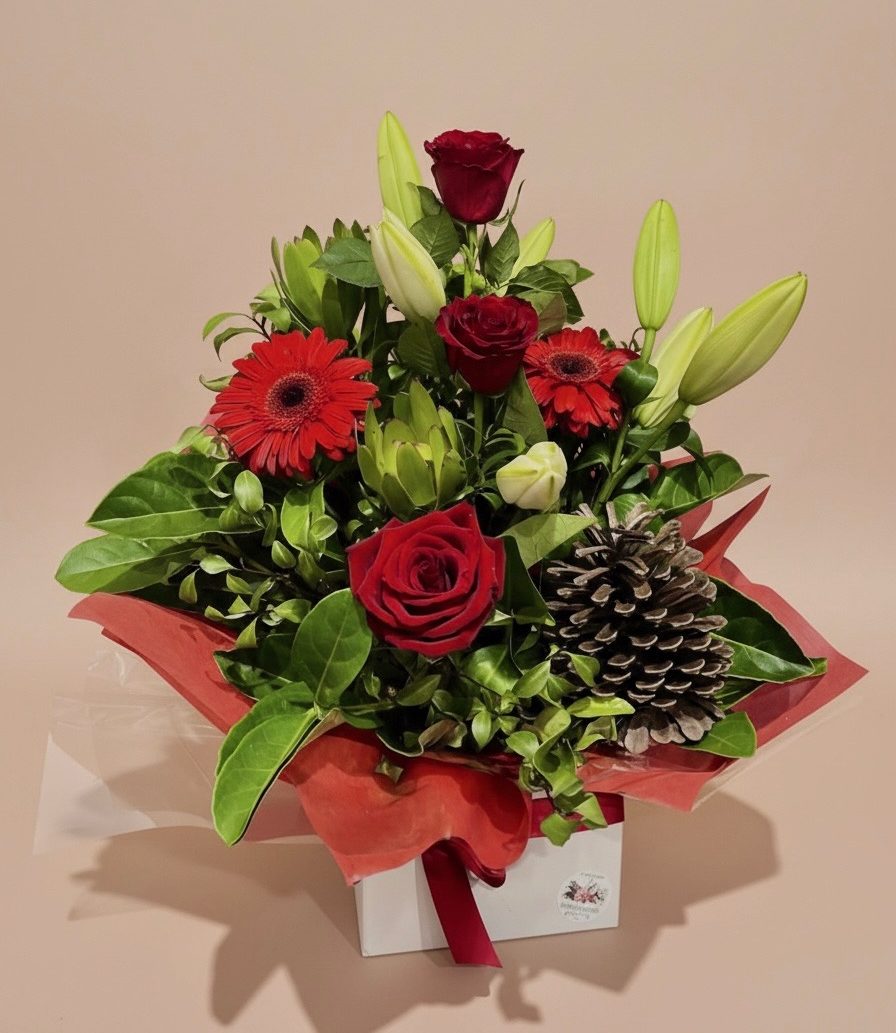 Our Designer’s Choice Christmas flower arrangement is a custom festive boxed design created by our florists using the freshest red, white and seasonal holiday blooms available on the day. Simply select your preferred budget and our team will craft a beautiful Christmas arrangement styled in a gift box with complementary festive elements and premium foliage. Each piece is unique and reflects our signature Flowers of Southport style, offering the perfect option when you want something thoughtful, joyful and beautifully seasonal.