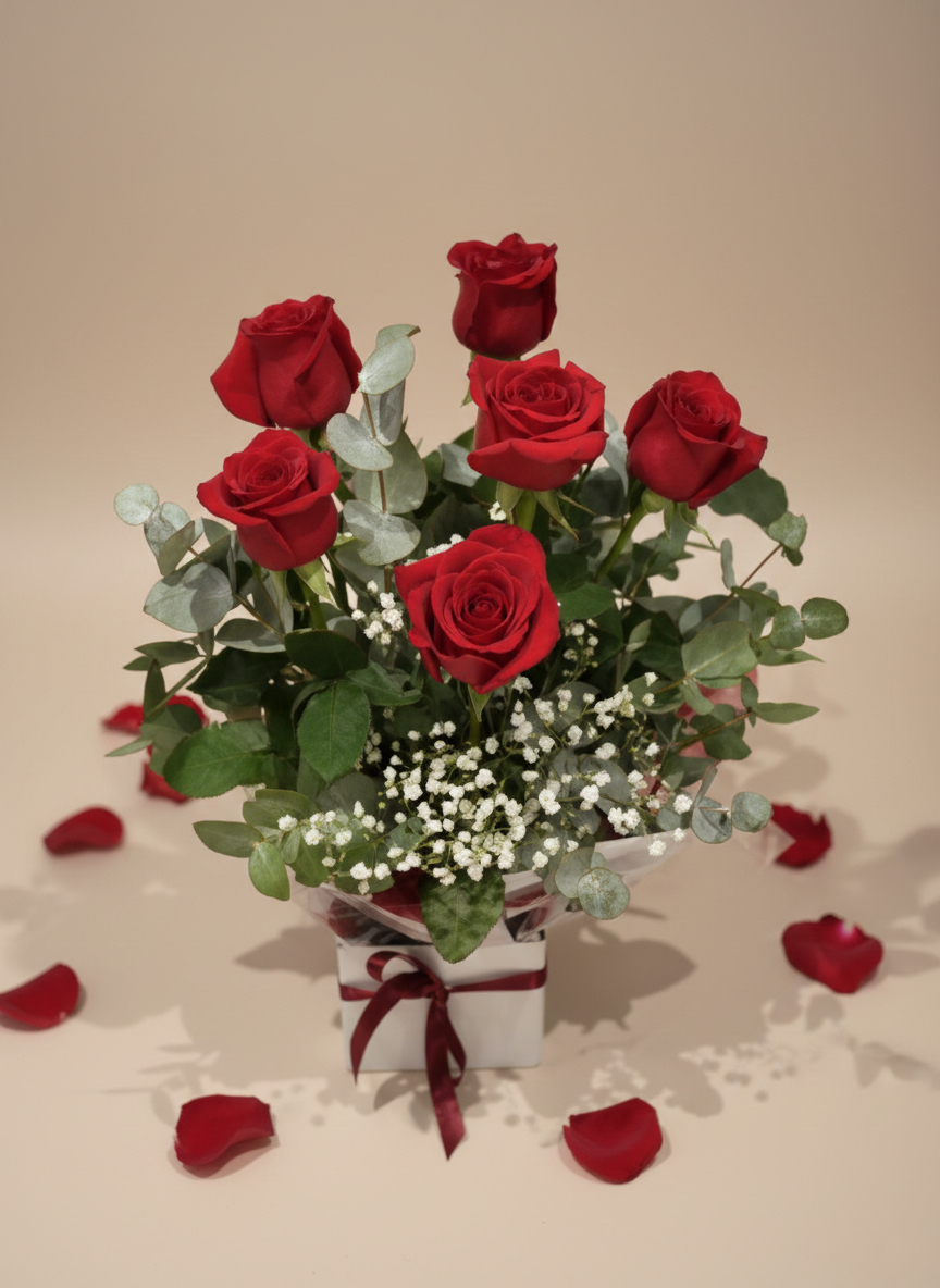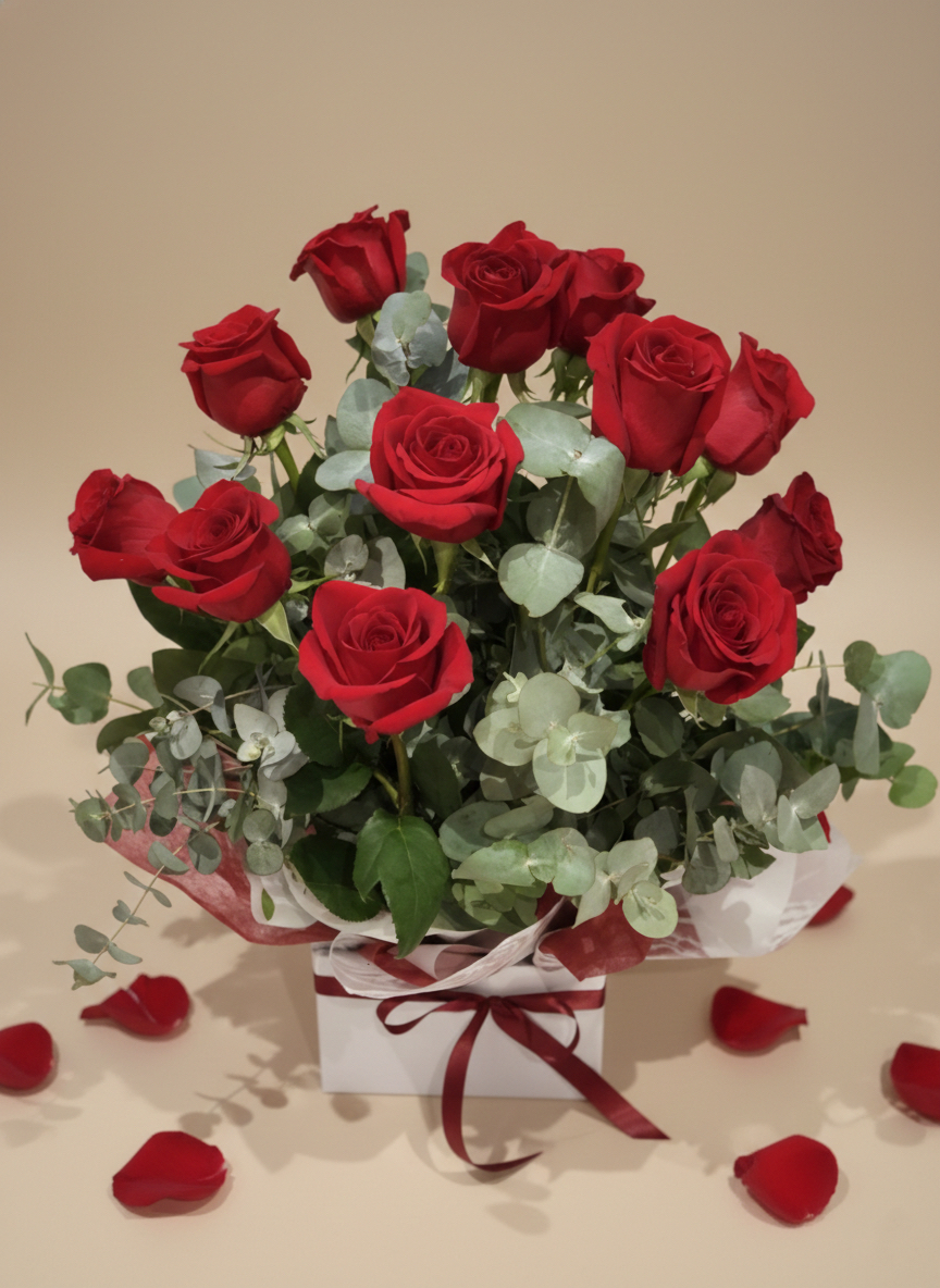 Our Red Rose Box Delivery Gold Coast service features one of our most loved romantic gifts on the Gold Coast. Andreina is a luxurious boxed arrangement available in 6, 12, or 24 long-stem premium Colombian roses, accompanied by lush greenery that adds elegance and volume.
