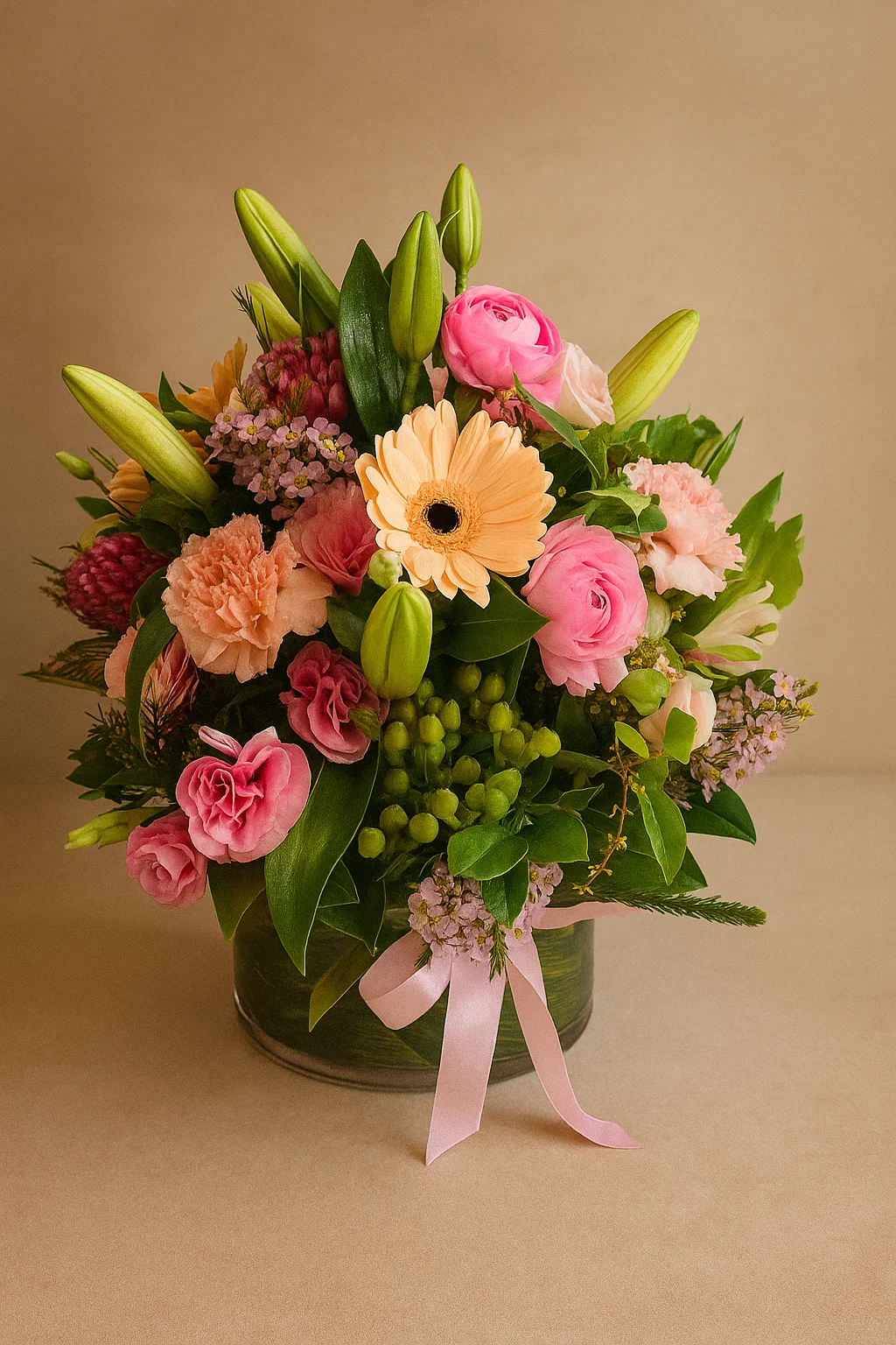 The Andrea pastel or bright rose and lily arrangement is a timeless floral design styled in a clear round glass vase and finished with a satin ribbon. Carefully crafted to bring both beauty and warmth, this arrangement is perfect for gifting — whether for anniversaries, heartfelt thank-you’s, birthdays, or just because.