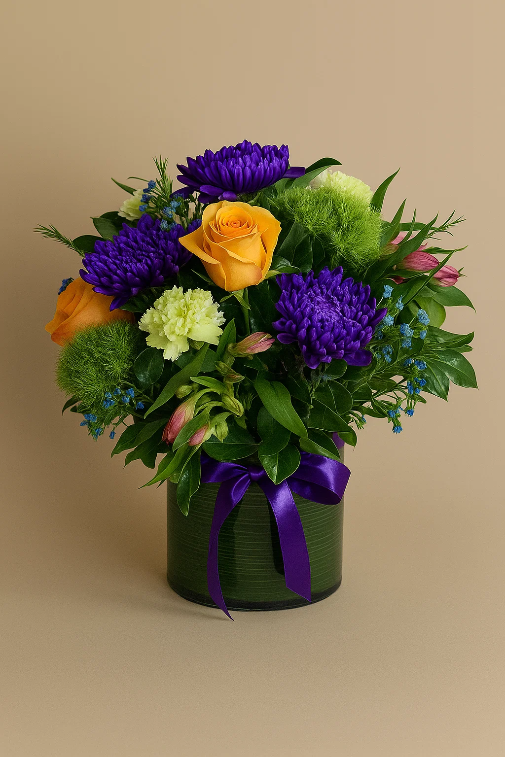 As seasonal flowers vary, the exact bloom selection may change. However, every rose and lily arrangement is created to reflect Andrea’s signature style — a thoughtful, artful design that’s ready to display straight from the box.