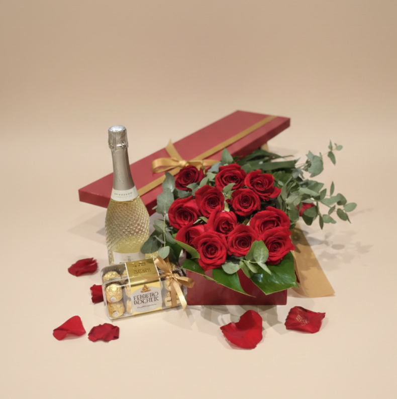 Red roses with champagne and chocolates presented in a luxurious gift box — the perfect romantic surprise for anniversaries, proposals, and unforgettable moments.